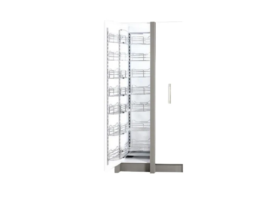 سبد سوپر یخچالی یونیت ۵۰ برای کابینتهای مرتفع کنار یخچال طراحی شده و دسترسی از روبهرو را با حرکت کشویی کامل فراهم میکند. مناسب برای نگهداری بطریها و اقلام بلند.
